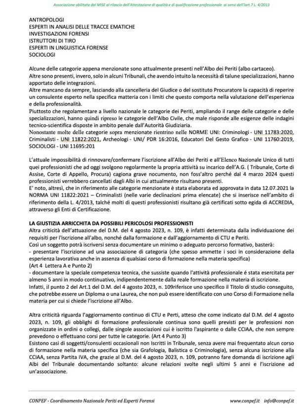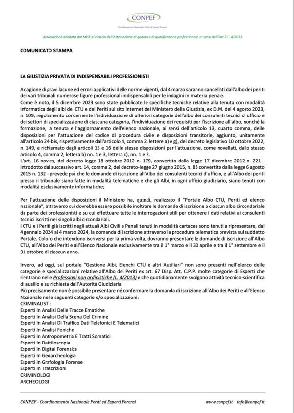 Il CONPEF - Coordinamento Nazionale Periti ed Esperti Forensi riunisce tutti i Professionisti che lavorano in campo giudiziario e disciplinati ai sensi della legge n° 4/2013.